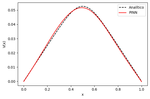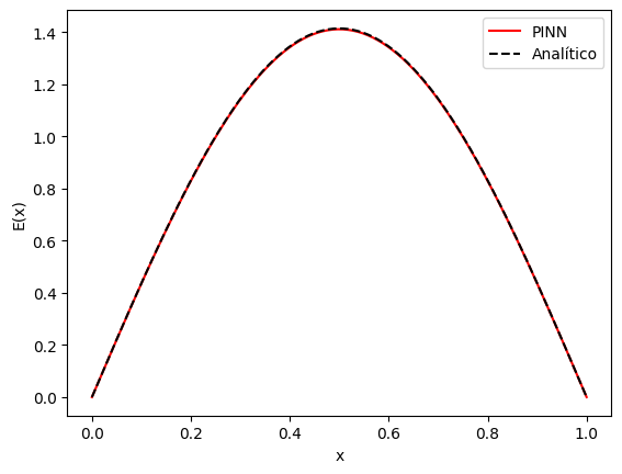 Entrenaremos una PINN para aprender \(E(x)\) para un valor fijo de \(k\), por ejemplo \(n=1,\,L=1,\, \rightarrow k = \pi\), es decir, el modo fundamental.