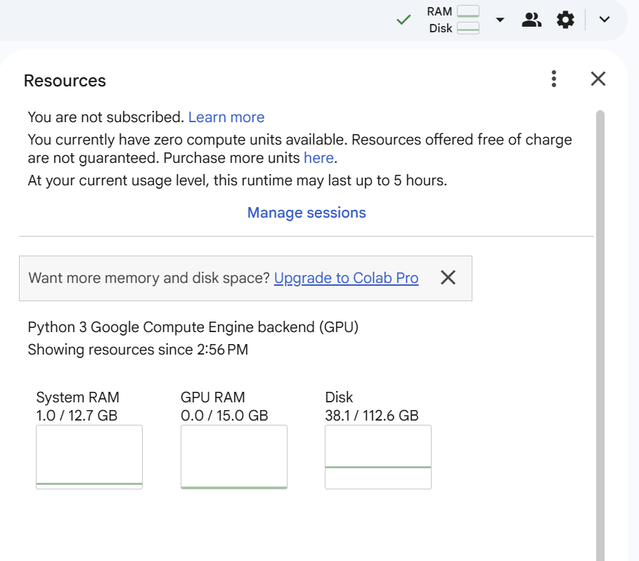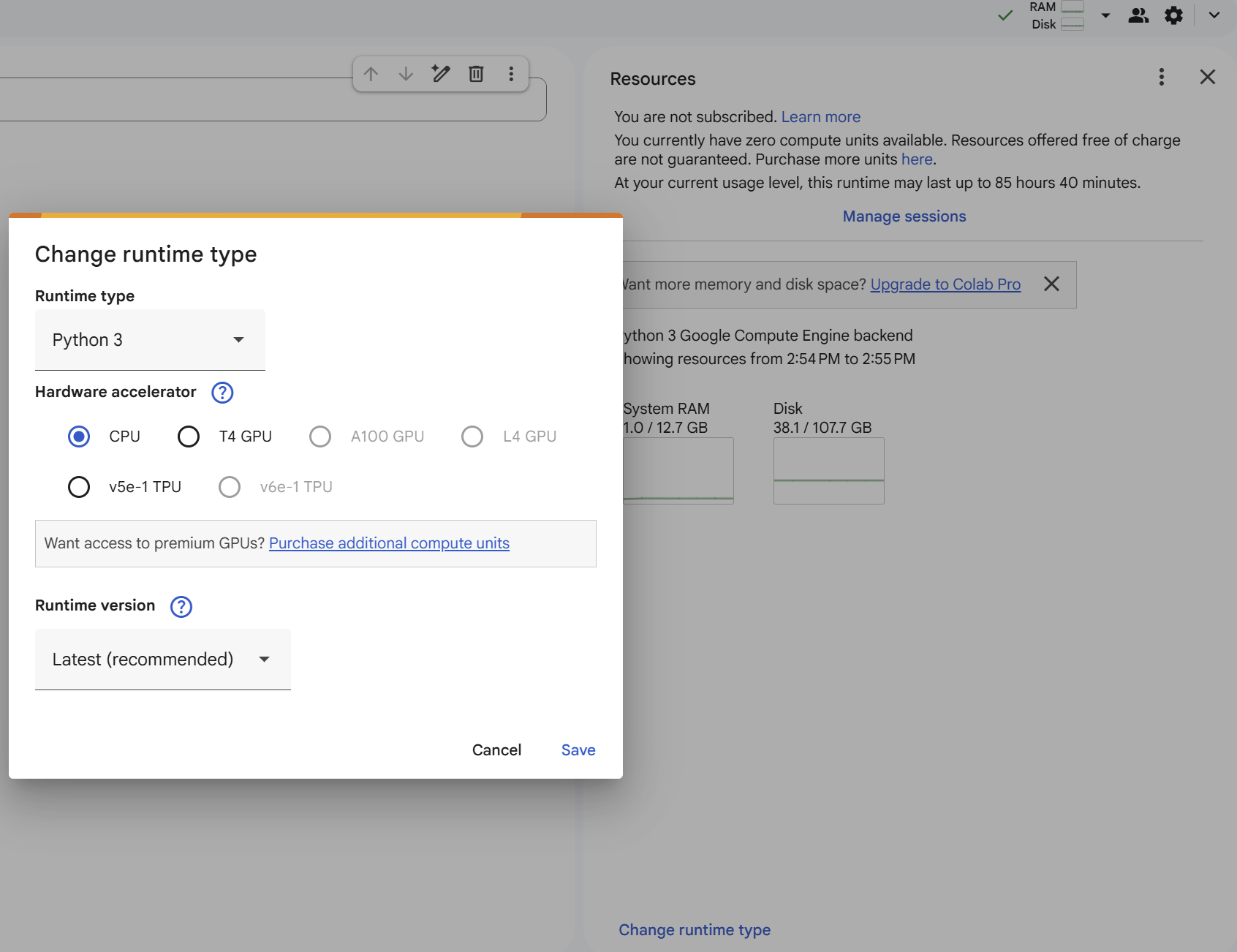 Aquí podrás especificar el hardware de tu entorno. Por ejemplo, puedes elegir “T4 GPU”. Una vez activado, deberías ver este recurso disponible:
